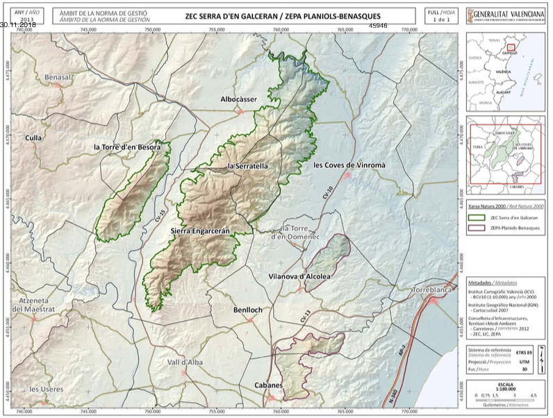 La superfície abasta 13.324,74 hectàrees i comprén els espais ZEC Serra d’en Galceran i ZEPA Planiols-Benasques, aquesta última afecta el terme municipal de Benlloc juntament amb Cabanes i Vilanova d’Alcolea.
