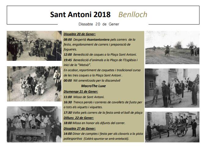 Els clavaris de Sant Antoni ens han fet arribar el programa d’actes de Sant Antoni per al dia 20 de gener de 2018, que compartim amb tots vosaltres a continuació.