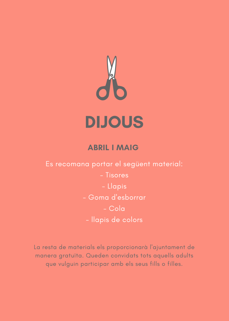 El taller serà cada dijous dels mesos d’abril i maig a les 17:30h, i en cada sessió es farà un treball manual individual diferent de l’anterior.